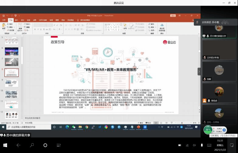 接着,双方就数字媒体实验室建设等议题进行了深入的交流。数字媒体专业负责人付少峰老师介绍了计科院数字媒体专业的发展历史、毕业生就业情况以及专业建设的相关需求,付老师提到西电数字媒体专业培养的人才更偏技术,基础扎实、能力过硬,受到用人单位欢迎,希望双方合作应深入且具备可持续性。金山云合作伙伴、触角科技CEO苏中谦则从政策引导、合作模式、XR实验中心、多场景教学模式、教学内容设计等方面详细介绍了公司在数字媒体实验室建设方面的经验和案例。金山云AIoT事业部高级商务经理任阿伟介绍了正在设计的竹园员工公寓创新实验室的智能化建设方案,该创新实验室的建设旨在为员工提供一个好用、易用、能自主管理、可参与开发的多功能智慧实验场所,方案以“金山云”和“小米”软硬件设施为基础,技术先进、功能全面。最后,金山云高级技术经理丁明辉介绍了“西电-金山云人工智能产学研算力中心”建设方案,该方案面向疫情影响下的实验教学和未来的智慧教育,借鉴金山云在教育领域已经取得的一站式在线教育经验构建线上高性能实践教学环境,可优化中心现有智慧实验室管理环境,提升管理效率。