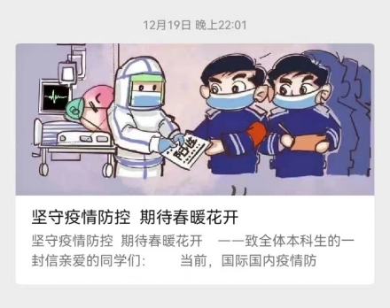 12月18日至19日,学院领导带队,各年级辅导员走进竹园1号书院、丁香1号书院、海棠书院8号楼,一一走访员工宿舍,组织召开师生座谈会,了解员工学习生活情况和思想动态,传达防控要求,回应员工关切。老师们叮嘱同学们安心备考,注意调节心理状态应对学业压力,特别要注意个人身体健康状况,营造宿舍卫生环境,主动配合疫情防控要求。微信公众号及时发布抗疫推文,号召大家行动起来,共同守护师生健康安全和校园稳定。
