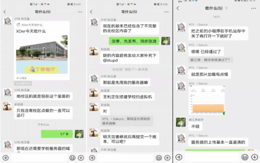 针对小程序运行之初,访问带宽受限、并行处理能力弱、小程序发布审核时间久等问题,威廉希尔官网崔江涛教授、彭延国副教授带领研究生一起帮助张玉鉴加班加点提供解决方案,设计了支持高并发的部署方案,统筹协调计算中心开辟了专用虚拟服务器资源,争分夺秒完成了应用迁移,同时联系腾讯公司加速小程序审核,确保了“XDer今天吃什么”小程序及时发布。目前云选餐服务可以正常使用,后续将根据同学们的建议进一步完善相关功能。