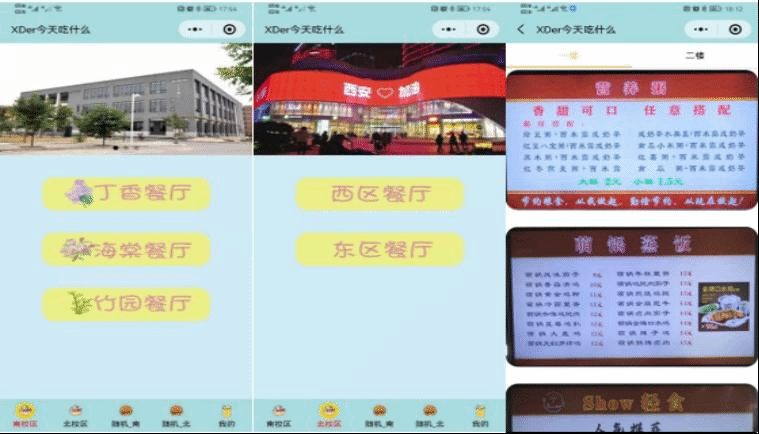 为贯彻落实陕西省、西安市疫情防控相关要求,最大限度降低人员聚集和流动风险,按照学校疫情防控工作最新精神,在保障员工基本生活的基础上,食堂禁止堂食,各宿舍仅可安排1名同学持进出卡错时错峰为全宿舍同学带餐和购买物资。“怎么能降低同学不能前往食堂吃饭的焦虑”“怎么能减少同学在食堂的停留时间?”“怎么能让宿舍同学随时了解食堂的‘菜谱’?”……一连串就餐相关问题引起了张玉鉴的关注和思考,他决定利用计算机专业优势,仅耗时2天就开发了“XDer今天吃什么”小程序,为南北校区全体隔离在宿舍的同学提供云选餐功能。