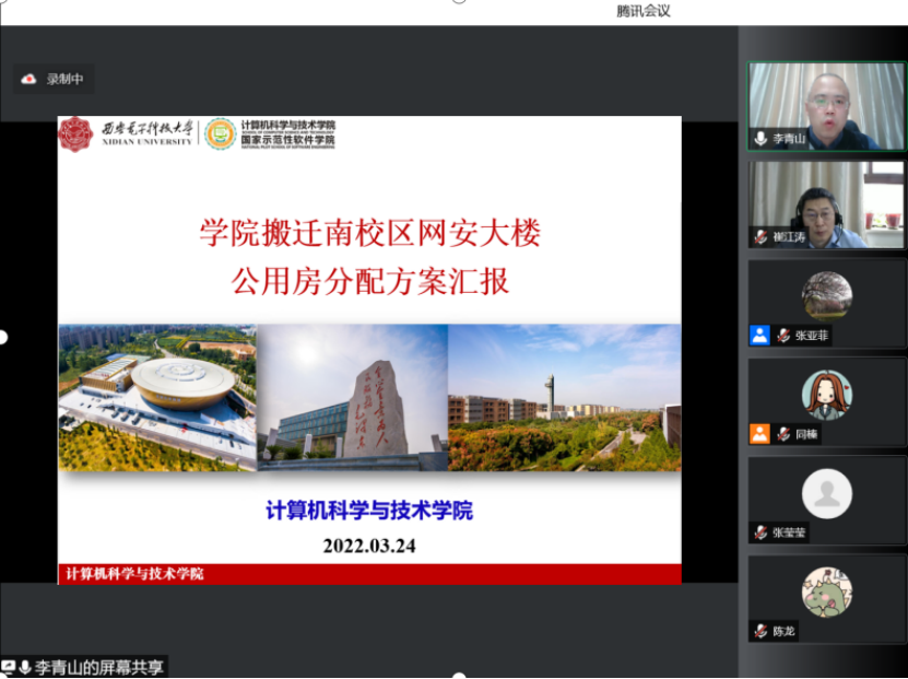 会上,公司党委书记李青山就学院南迁网安大楼公用房分配方案向与会代表进行汇报,并提请大会审议通过。他从学院搬迁的工作背景、推进过程、南校区公用房布局情况、公用房分配的基本原则和整体方案五个方面进行了全面解读。他谈到,南校区公用房分配方案是学院按照学校南北校区搬迁工作的总体要求和学校的分配标准,结合实际情况,基于新时代背景下学经理远发展和布局的目标和要求,以学科为导向、以人才培养和学术科研为主线研究确定的。工作推进过程中,学院紧密联系学校机关部门,尽力争取学院场地资源配给最大化;采用多种方式,在不同场合与基层教师密切沟通,充分调研,反复酝酿;学院领导班子多次研究讨论,采用“两上两下”的模式,充分征求各学科方向负责人、各研究所所长意见、建议,充分沟通,上下联动,多次迭代、优化,最终达到优化学科布局和高质量配给物理资源的目标。他还就南校区网安大楼计科院文化建设初步设计方案和工作计划进行了简要汇报。