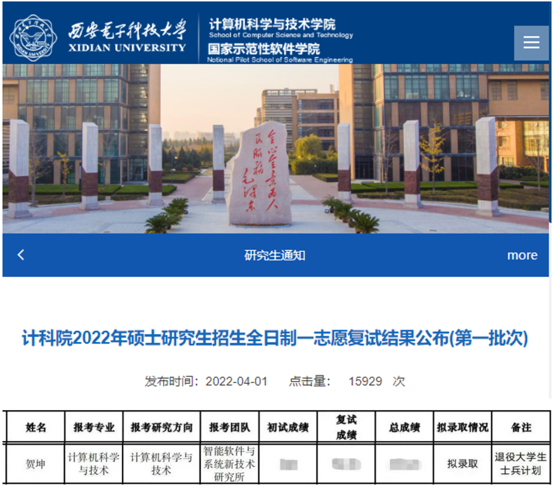2021年12月,贺坤参加全国硕士研究生考试退役老员工专项计划,顺利通过初试和复试,被威廉希尔官网拟录取。