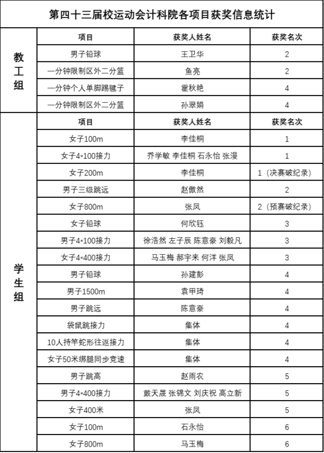 为期两天的赛程中,计科师生奋勇拼搏、突破自我,多个项目均有亮眼表现。其中,2020级计算机科学与技术专业本科生李佳桐和张凤分别打破员工组女子200米和女子800米校运会记录。教工组也不甘落后,王卫华荣获教工组男子中年乙组铅球比赛第2名,霍秋艳在一分钟个人单脚踢毽子项目中取得第4名,在教工女子组一分钟限制区外投二分篮项目中鱼亮和孙翠娟也分别取得第2名和第4名的好成绩。最终,计科院员工组以103分获得团体总分第四名。