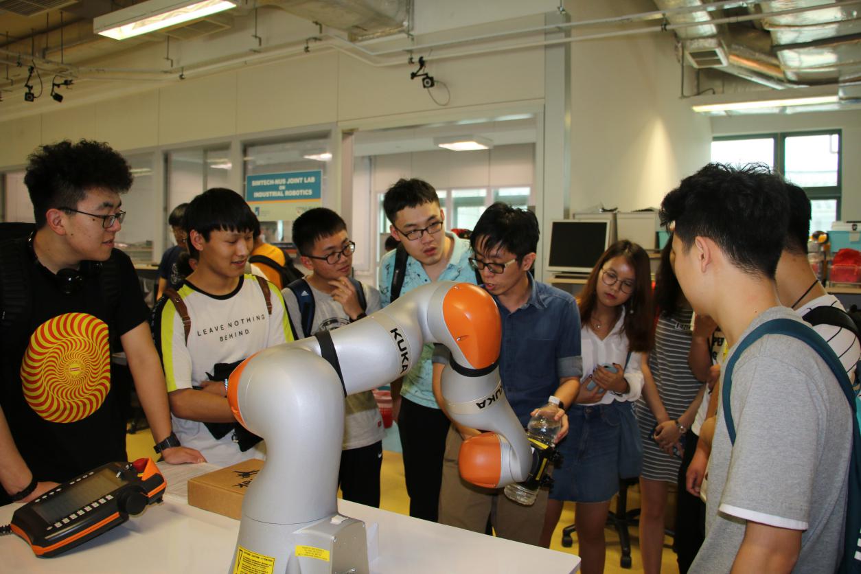 在听完教授们的报告后,同学们已迫不及待想与机器人进行亲密接触。在新加坡国立大学的机器人实验室,同学们接触到了最新的各式机器人,如自动驾驶机器人、握手机器人和由气压控制改变形态的充气机械臂等。前些年大热电影《超能陆战队》中的大白机器人,也是其导演在参观实验室后受充气机器臂的启发而诞生的,在实验室博士生的深入介绍下,同学们对机器人的工作原理有了深入的了解,同时也体会了机器学习等人工智能技术在机器人领域的应用情况。