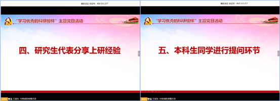活动开始,青年委员王旭东首先为大家介绍了一些取得了优异成果的优秀研究生榜样及支部内的优秀党员榜样,带领大家学习他们的科研心得和精神,并表示员工党员更应该在学习科研中发挥带头作用,不忘初心,持之以恒,做好科研,做出表率,为建设科技创新型国家而努力。