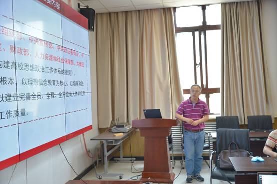 李青山领学教育部等八部门印发的《关于加快构建高校思想政治工作体系的意见》,带领与会成员集体学习了理论武装体系、学科教学体系、日常教育体系、管理服务体系、安全稳定体系、队伍建设体系和评估督导体系等七大体系的具体内容。李青山结合学院三全育人综合改革试点、联合支部党建育人作用发挥、课程思政建设等实际谈到,全院教师一是要统一认识,深入领会文件精神,把握《意见》精神实质;二是要积极谋划,认真落实。在支部活动、专业课程等方面强化对员工的政治引领和价值引导,不断加强党建带团建、学院文化培育、辅导员队伍建设的力度,将各项要求落到实处。李青山还针对“教育部思政司负责人就《意见》答记者问”进行了逐条说明。
