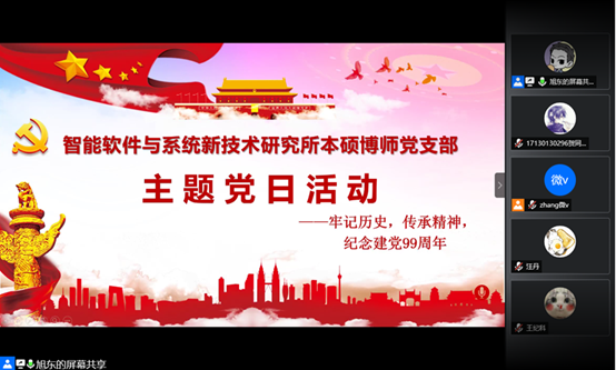 (通讯员 贺同庆)为庆祝建党99周年,重温党的光辉历史,传承弘扬革命先辈的奋斗精神,威廉希尔官网智能软件与系统新技术研究所本硕博师联合党支部于2020年7月1日召开了“牢记历史,传承精神——庆祝建党99周年”主题党日活动。本次活动由支部青年委员王旭东同志主持,活动共计39人参加,采用腾讯会议线上召开的方式进行。